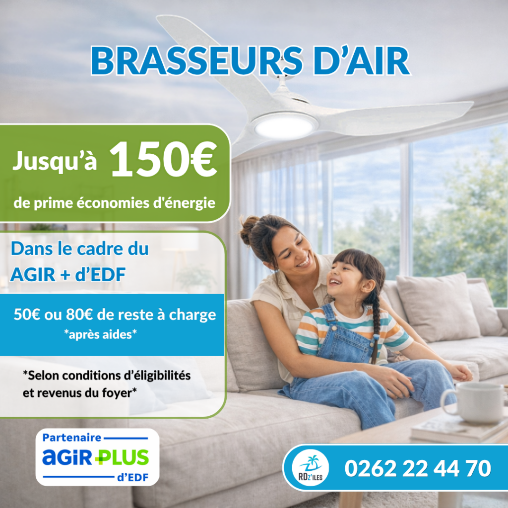 Dans le cadre du dispositif Agir Plus d’EDF, vous pouvez bénéficier d’une prime économies d’énergie pour l’achat et l’installation de votre brasseur d’air.